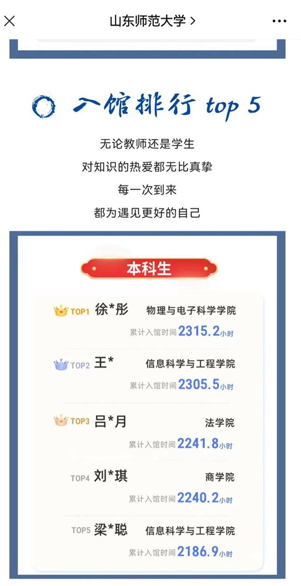 一年在学校图书馆“泡”了2300多个小时,这是一个什么样的大学生?近日,山东师范大学官方微信发布了一组学校图书馆2022年的学生入馆数据,全年在馆时间最长的一位本科生达到了2315.2小时。3月28日,齐鲁晚报·齐鲁壹点记者找到了这位山东师范大学物理与电子科学学院的大四学生徐晓彤。就在几天前,她刚刚确认考上了山东大学电子信息专业的研究生。