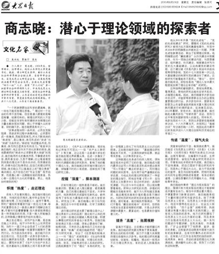 这种独特的敏锐眼光,使他站得更高,看得更远,使他的研究总能处在学术前沿,占据理论高地。因此,商志晓曾多次参加由中央召开、中宣部等部委联合主办的全国性重要理论研讨会,多次参加中央、国家有关部委及山东省委省政府就有关重大理论和实践问题进行的调研座谈、征询意见活动。2012年暑期,受党中央、国务院邀请,商志晓赴北戴河参加“专家休假”活动,受到习近平等党和国家领导人的接见。同年秋天,他参加党的十八大,受到众多国家级高端媒体访谈,十八大开幕当天,央视网以“高端访谈”专访商志晓一小时,他因此成为最早比较系统评说十八大理论创新和历史地位的学者之一。